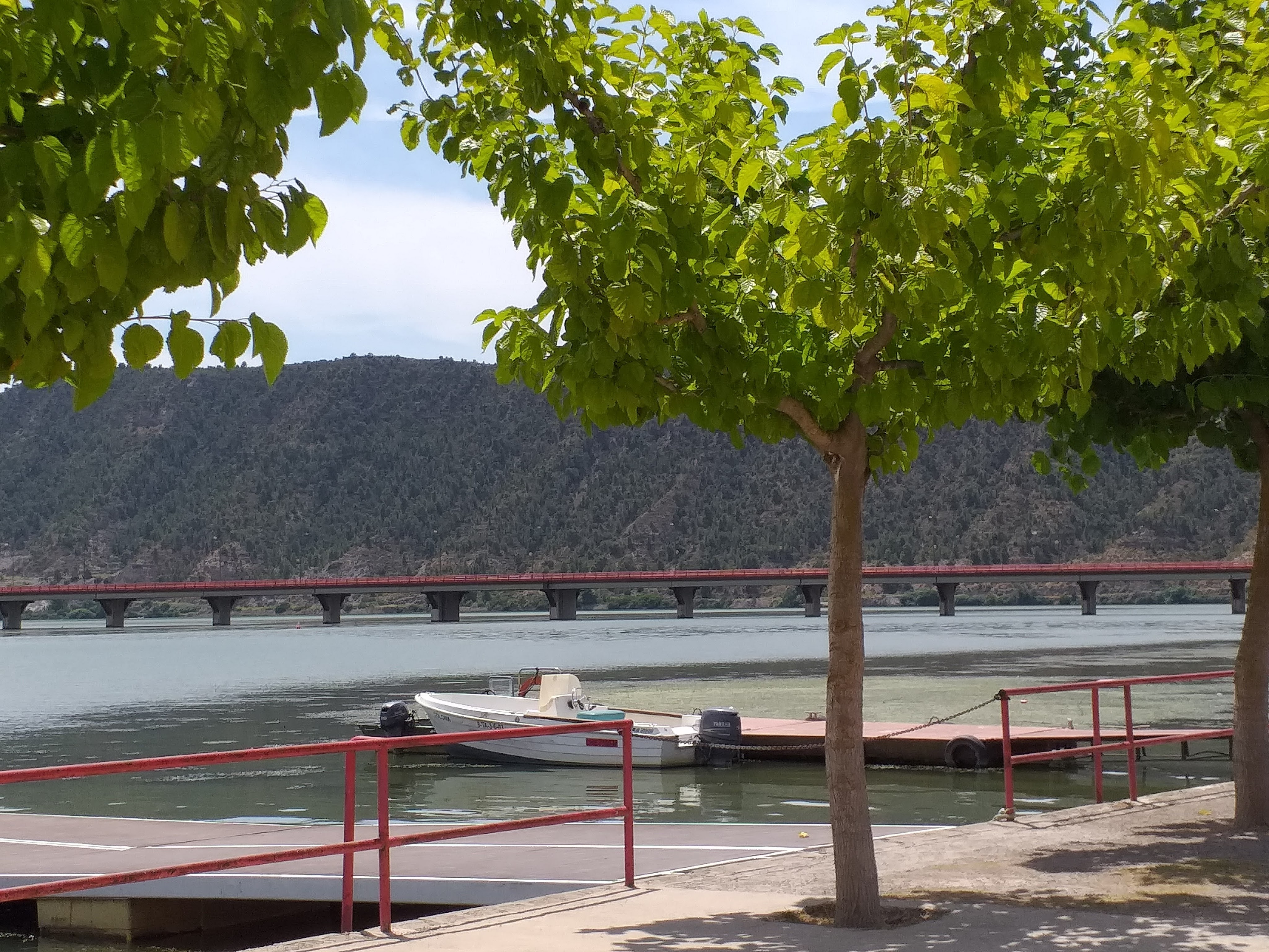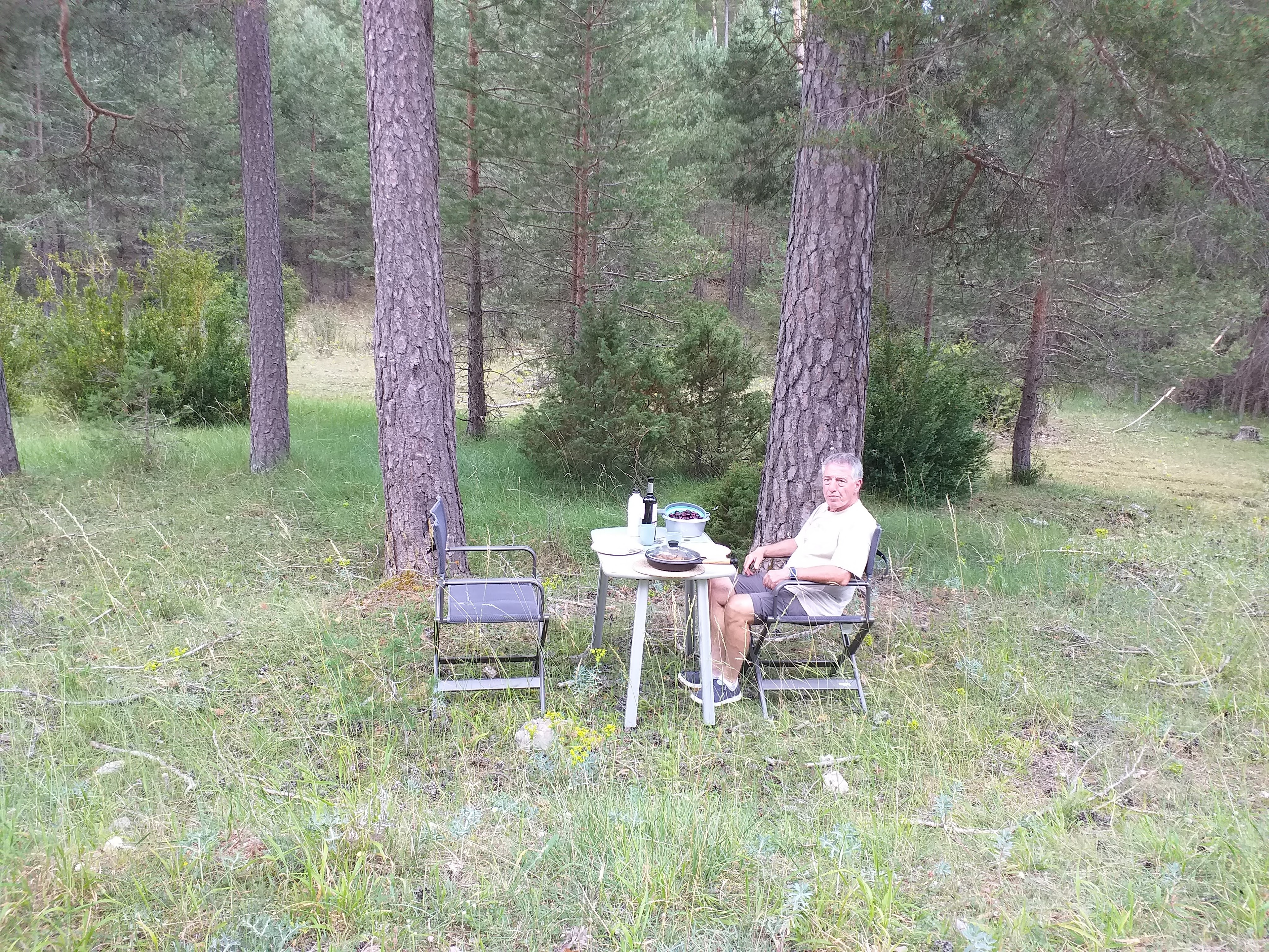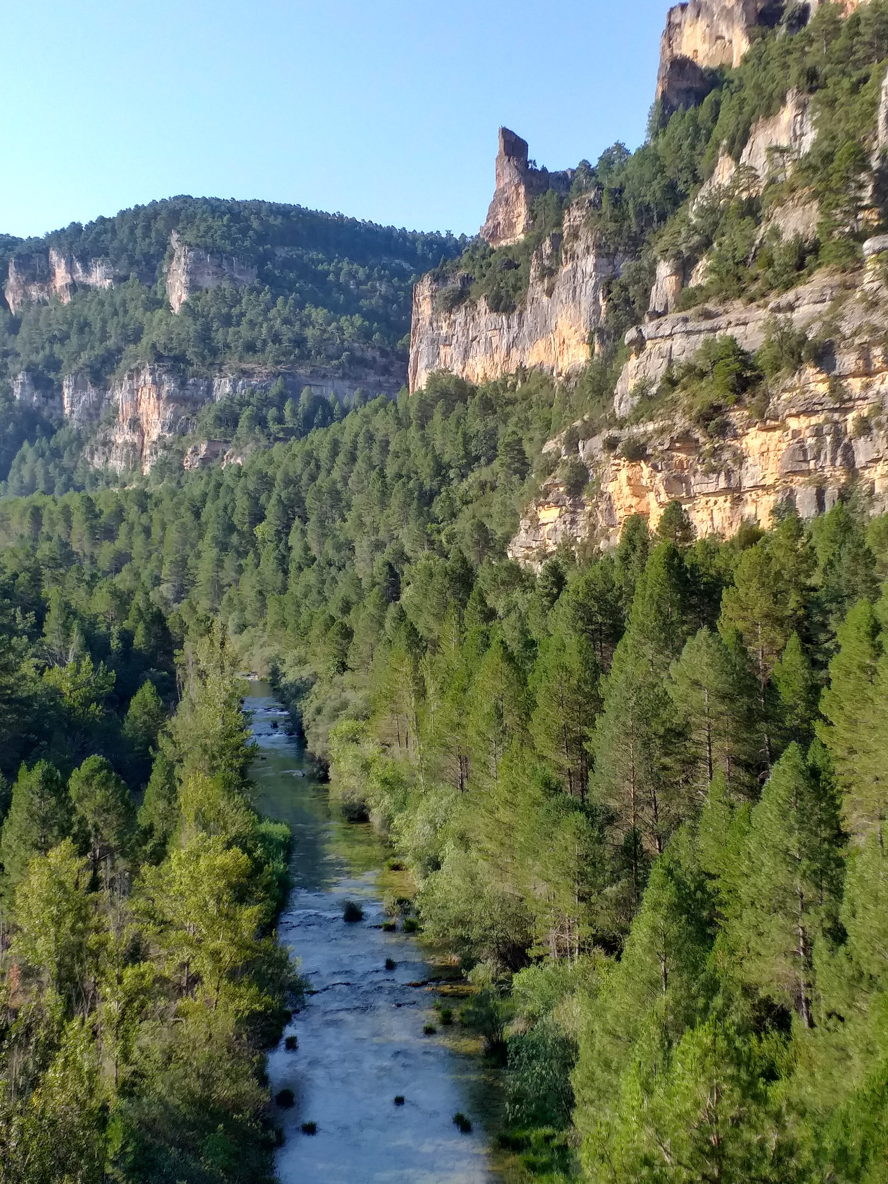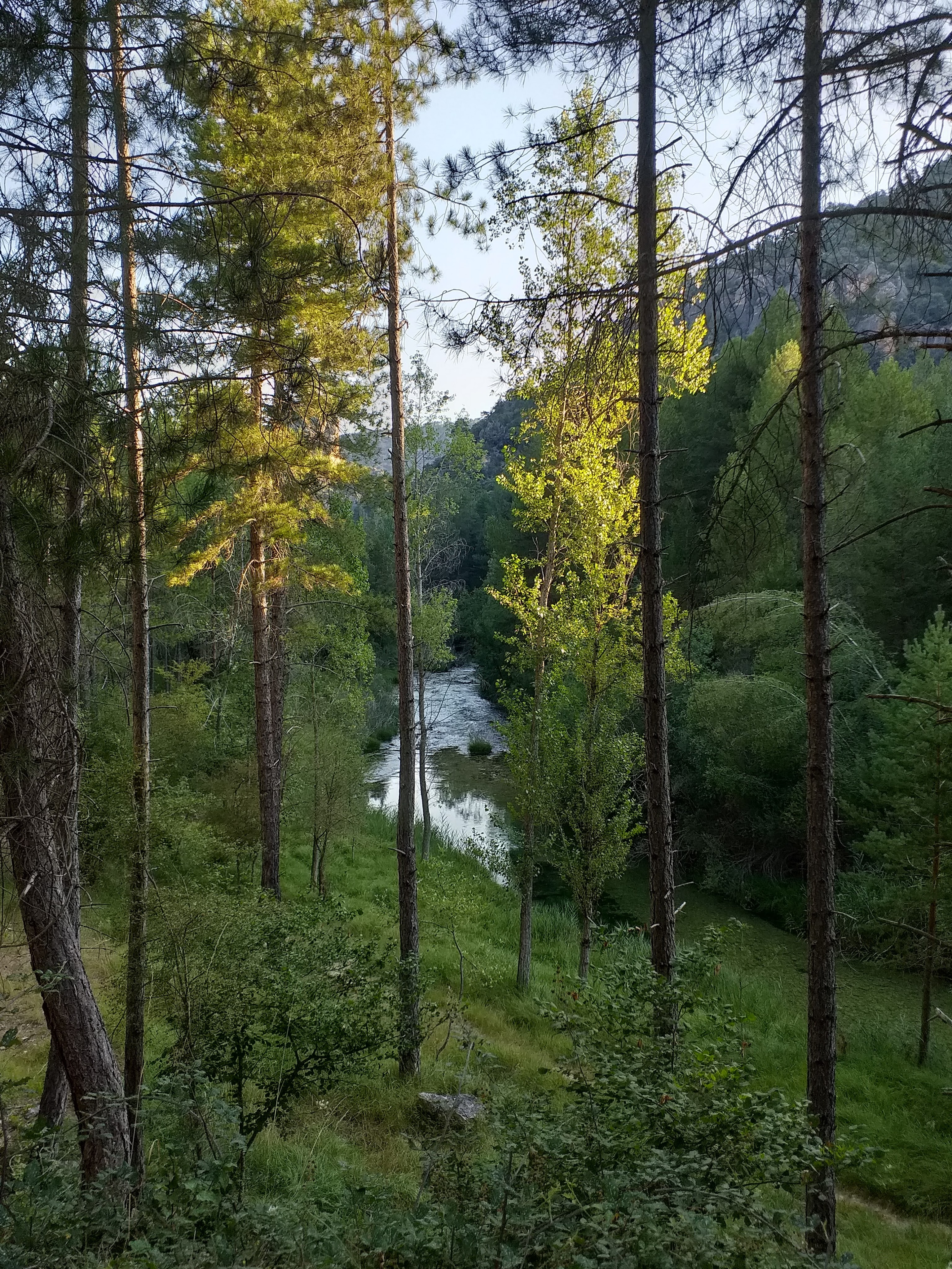 Ara ja estem a la zona del Alto Tajo que és magnífica i sobrada d’aigua i verd. Passem pel Salto Poveda també conegut com «Las Chorreras» que és un lloc refrescant i verd que conserva un tros del dic que van construir en el seu moment per a fer una central elèctrica i que va resultar, finalment i per sort, una iniciativa fallida. Aquí no ens podem banyar perquè està prohibit però ens en morim de ganes, així que busquem i finalment trobem un recó permès en plena natura i ens donem un bany al riu Tajo d’aigües cristallines i gens fredes per lo que jo m’esperava. Ens preparem a la vora del riu per passar aquí mateix la nit, sentint només els grills i el soroll de l’aigua.Ens hi estem una estona a la fresca preparant la ruta de dema de manera molt relaxant. A les 22h. hem sopat i estem al llit.