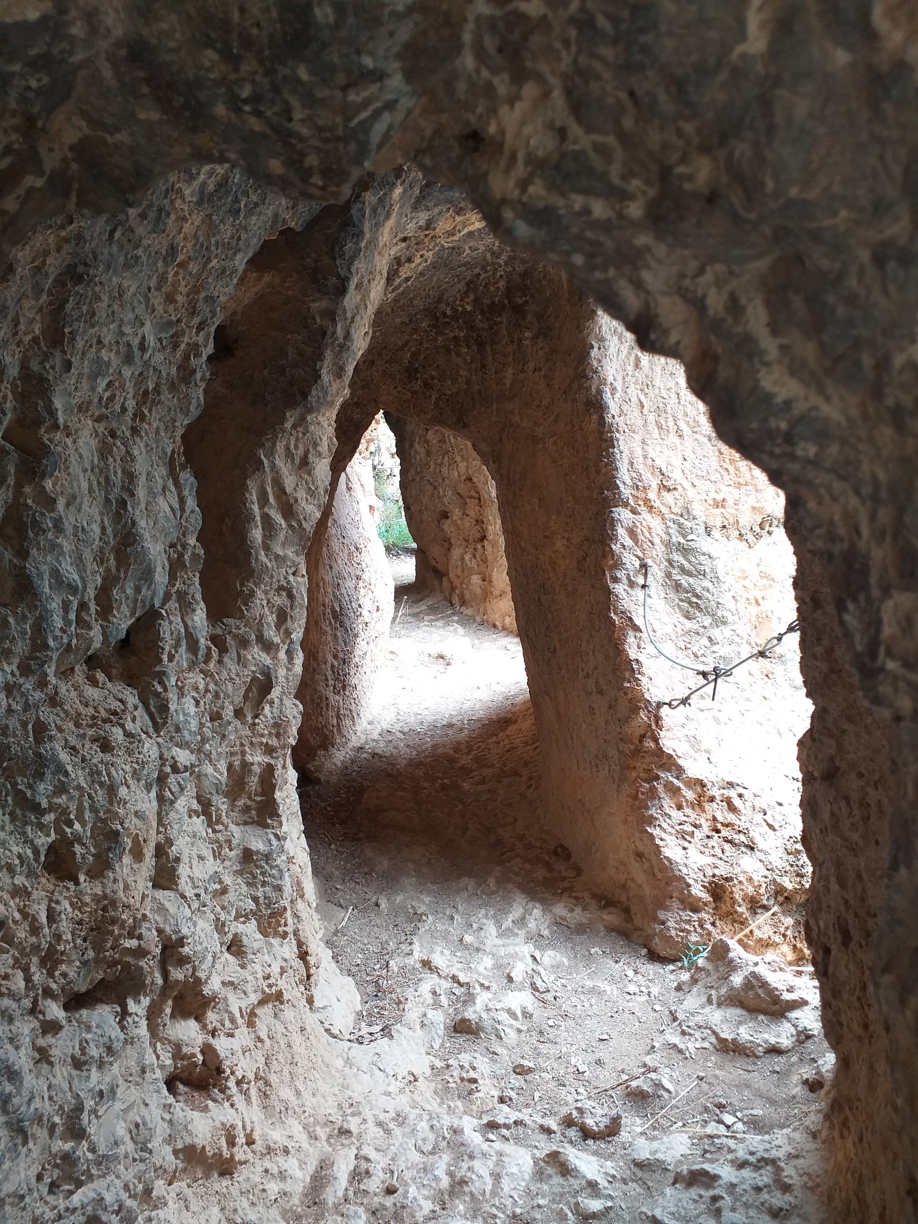 Observem un gran canvi de paisatge, de les planes de blat recent segat, a les agrestes muntanyes de la Serra d’Albarracin. Parem a veure la Galeria dels Miralls, un aqüeducte d’època romana excavada a la pedra i que era funcional per a portar l’aigua d’un lloc a l’altre.