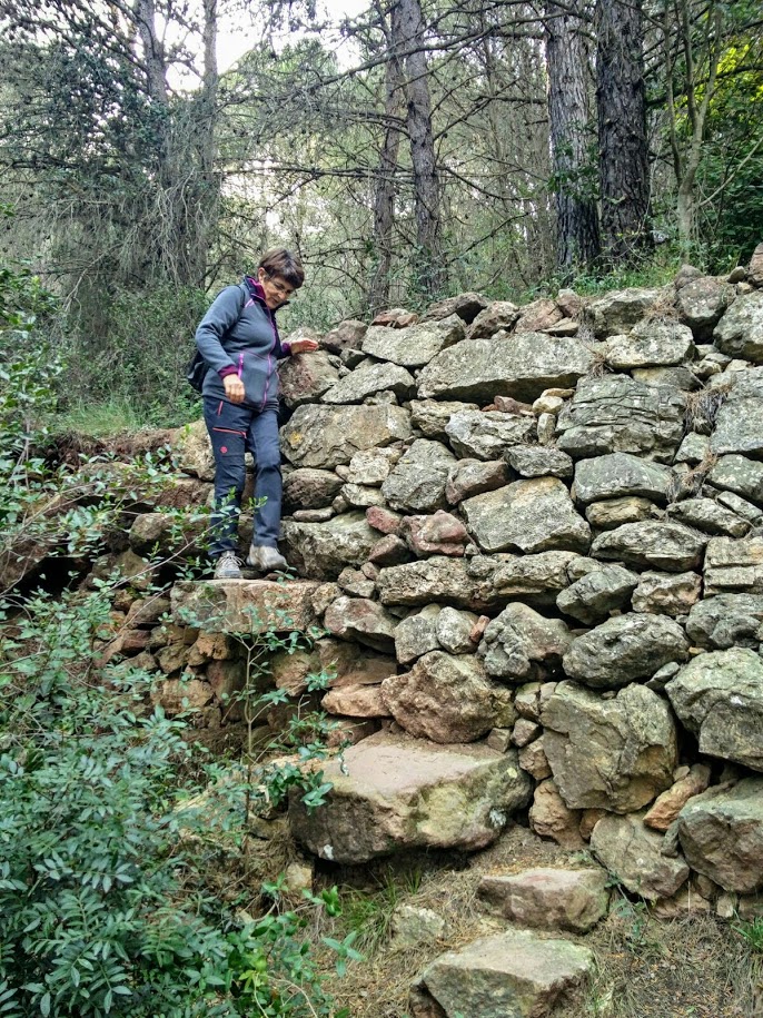 Baixem en direcció Montblanc per una pista que forma part del Camí del Cister (GR 175) i per una drecera que travessa diverses parets de pedra seca amb graons. És ben curiós i un clar símbol de la feina manual que poc a poc anem perdent, fins i tot els conreus que es veuen abandonats.
