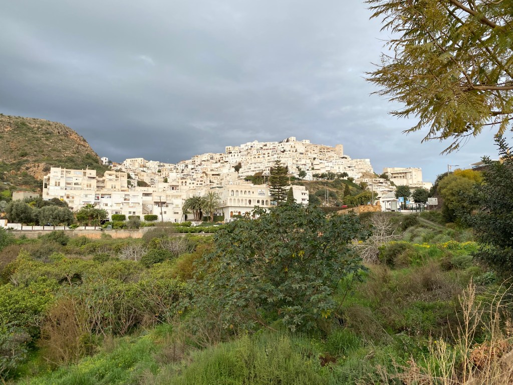 Pugem fins a Mojacar, poblet blanc, costerut i amb vistes màgiques de la vall i del mar que la llevantada d’aquests dies ha convertit en un monstre ferotge.