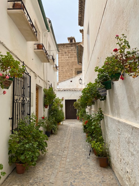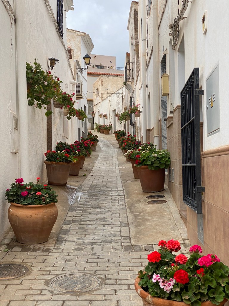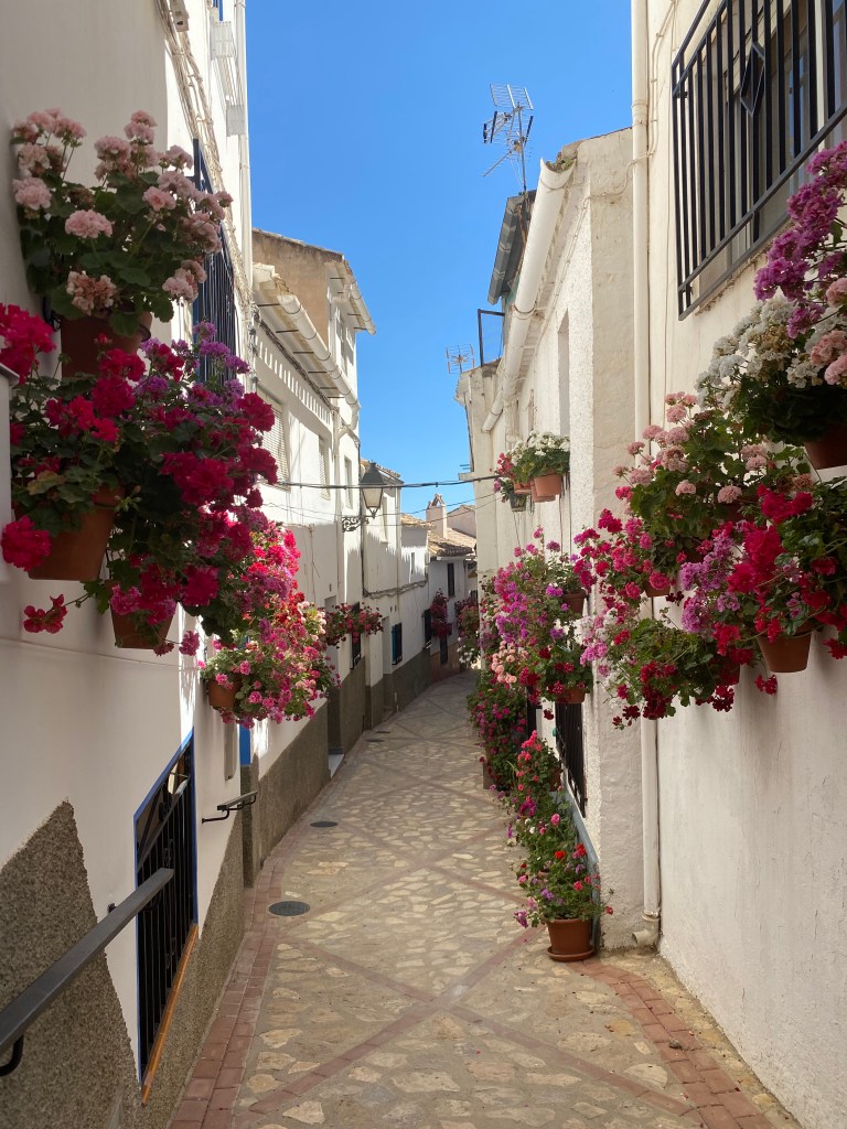 Fem un passeig pel poble i ens quedem amb la boca oberta: Tot és ple de geranis, les parets, les cases, les baranes, les places… tot son flors, és preciós!