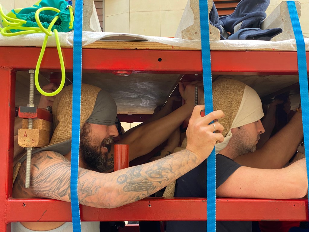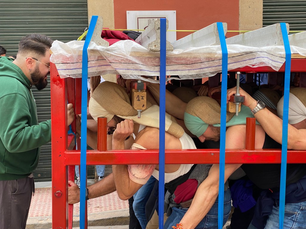 Parlant amb un d’ells ens ha dit que son 35 les persones que carreguen a les seves espatlles els 1.500kg que pesa la estructura i les imatges