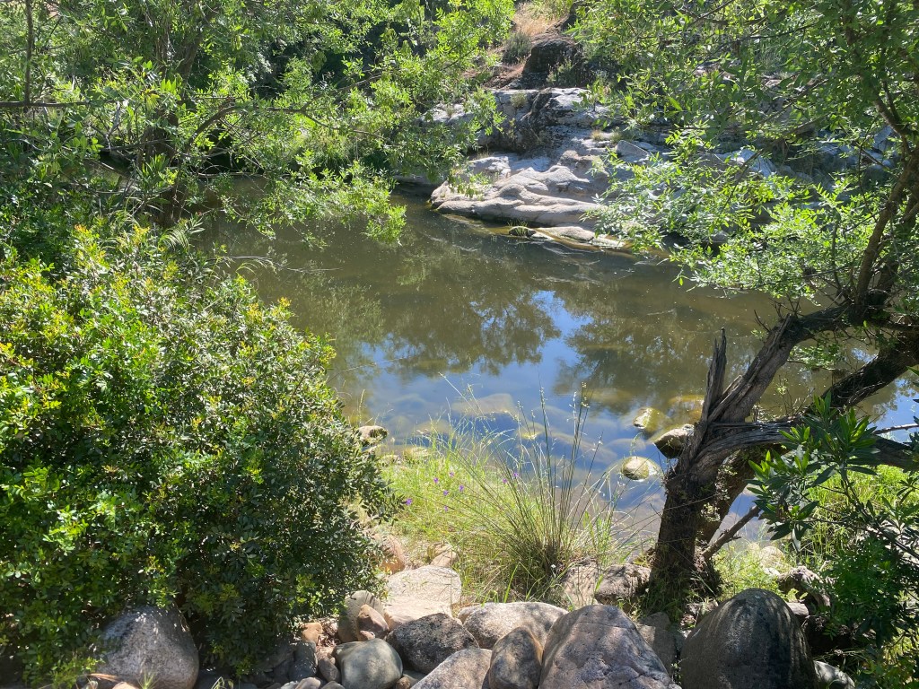 Aquest matí l’embassament del Portillo està preciós, en calma i transparent i anem cap a la sortida de la caminada de la Cerrada del riu Castril que comença en una petita rambla verda plena d’arbres diversos que dona una gran frescor a l’ambient.