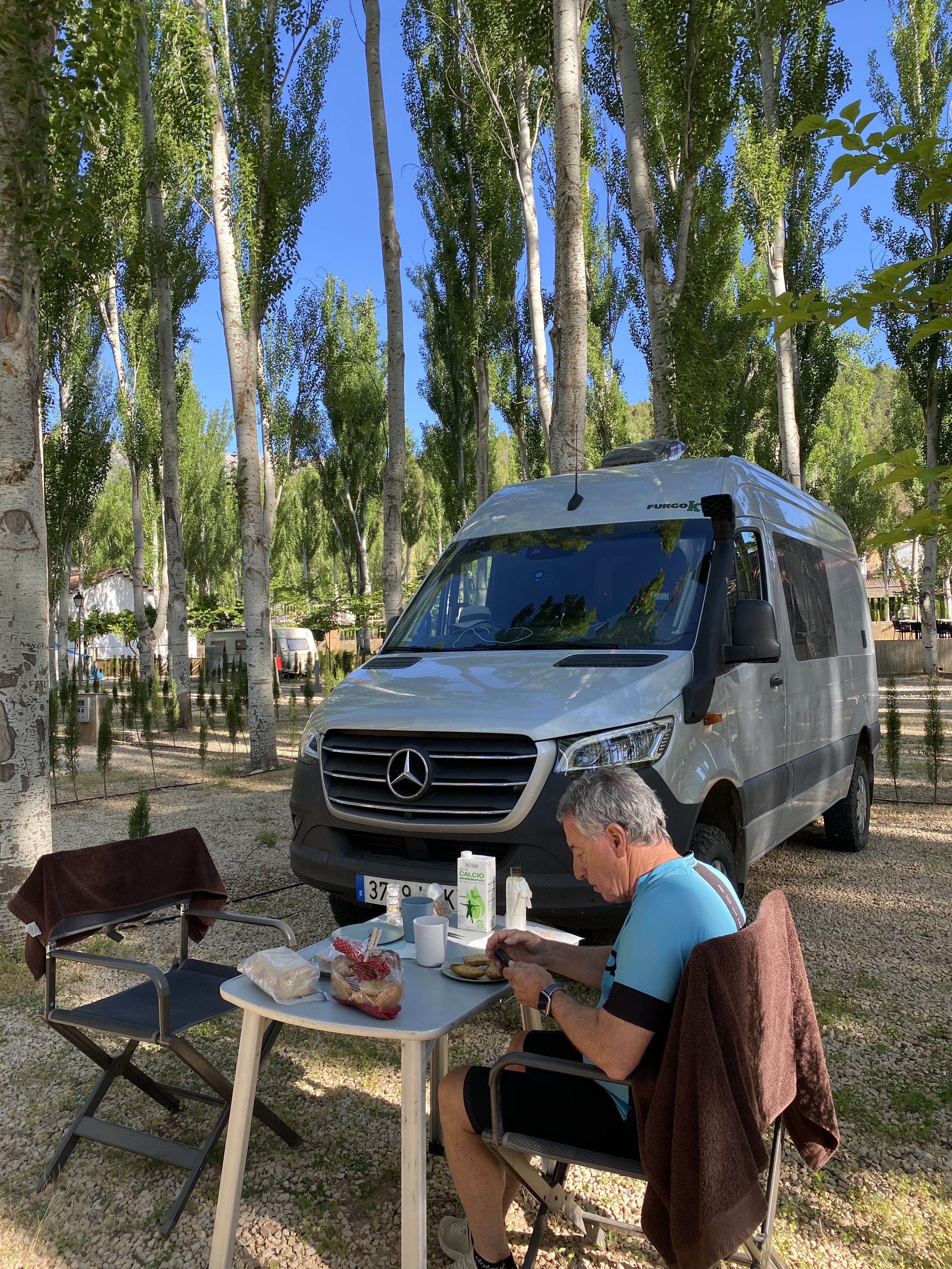 En Carlos ja ens ha donat excursions per a fer, però avui ens ve de gust descansar sota l’ombra dels pollancres (…i aquests ens han explicat que no tenen pol·len), després d’haver fet neteja de la furgo.