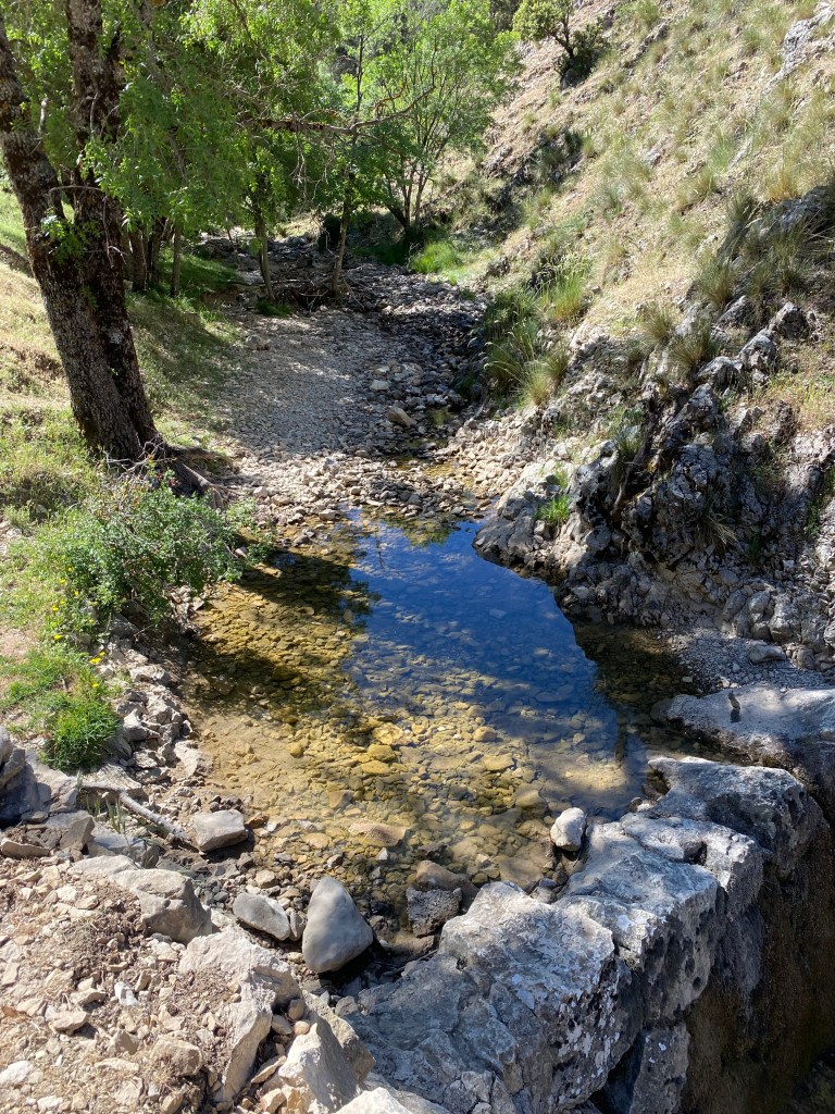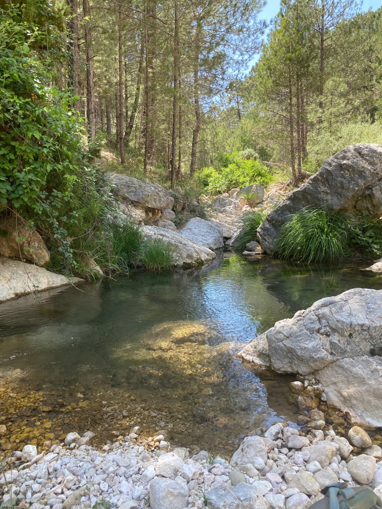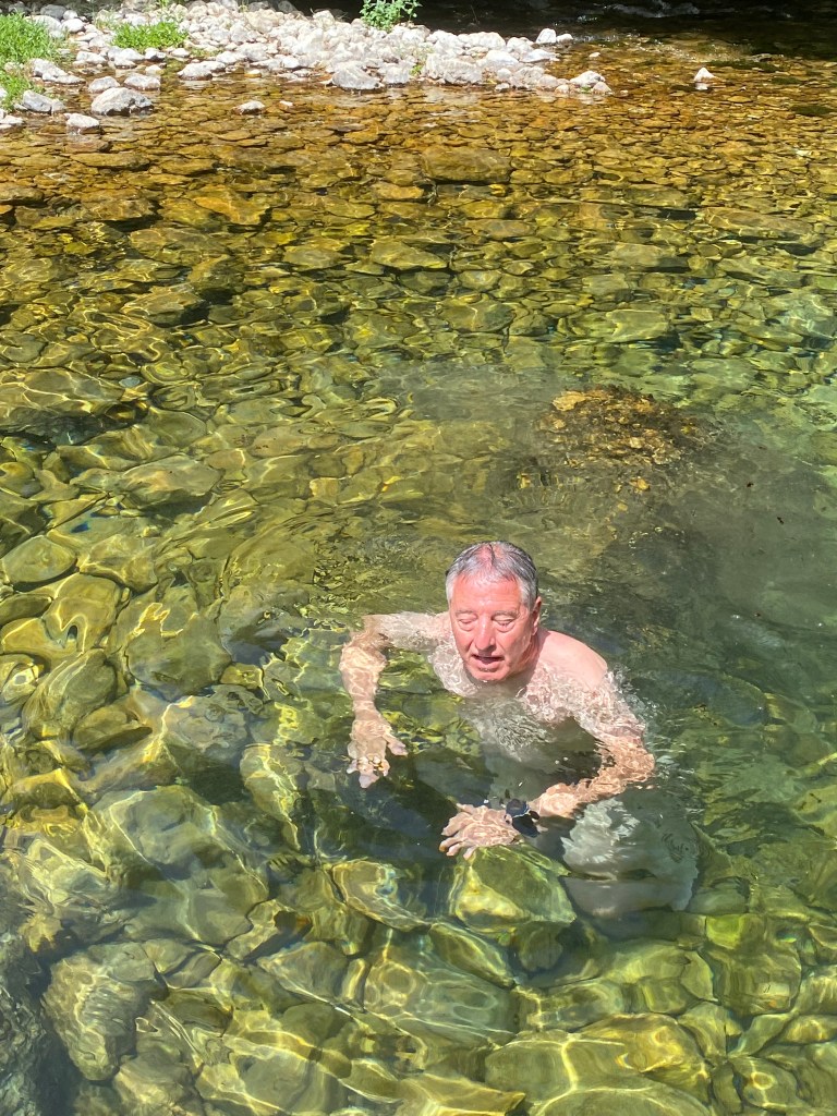 Aquesta zona és de roques kartiques que actuen com esponges que xuclen i retenen l’aigua i la deixen anar a mesura que estan plenes. És molt bonic tot el paratge. En Miquel, com no, s’ha banyat, però jo no he estat capaç de ficar-me del tot de freda que estava. Tan freda, que la sensació era com si et clavessin agulles a la pell. Em venia molt de gust el bany però he sortit de l’aigua a la velocitat de la llum.