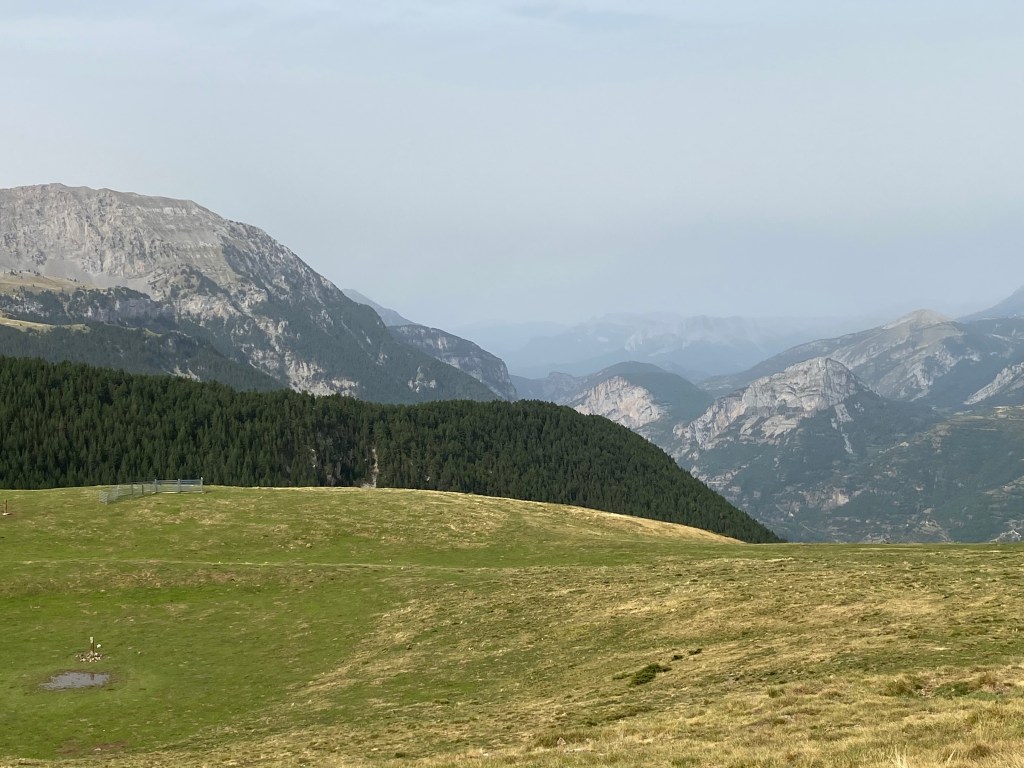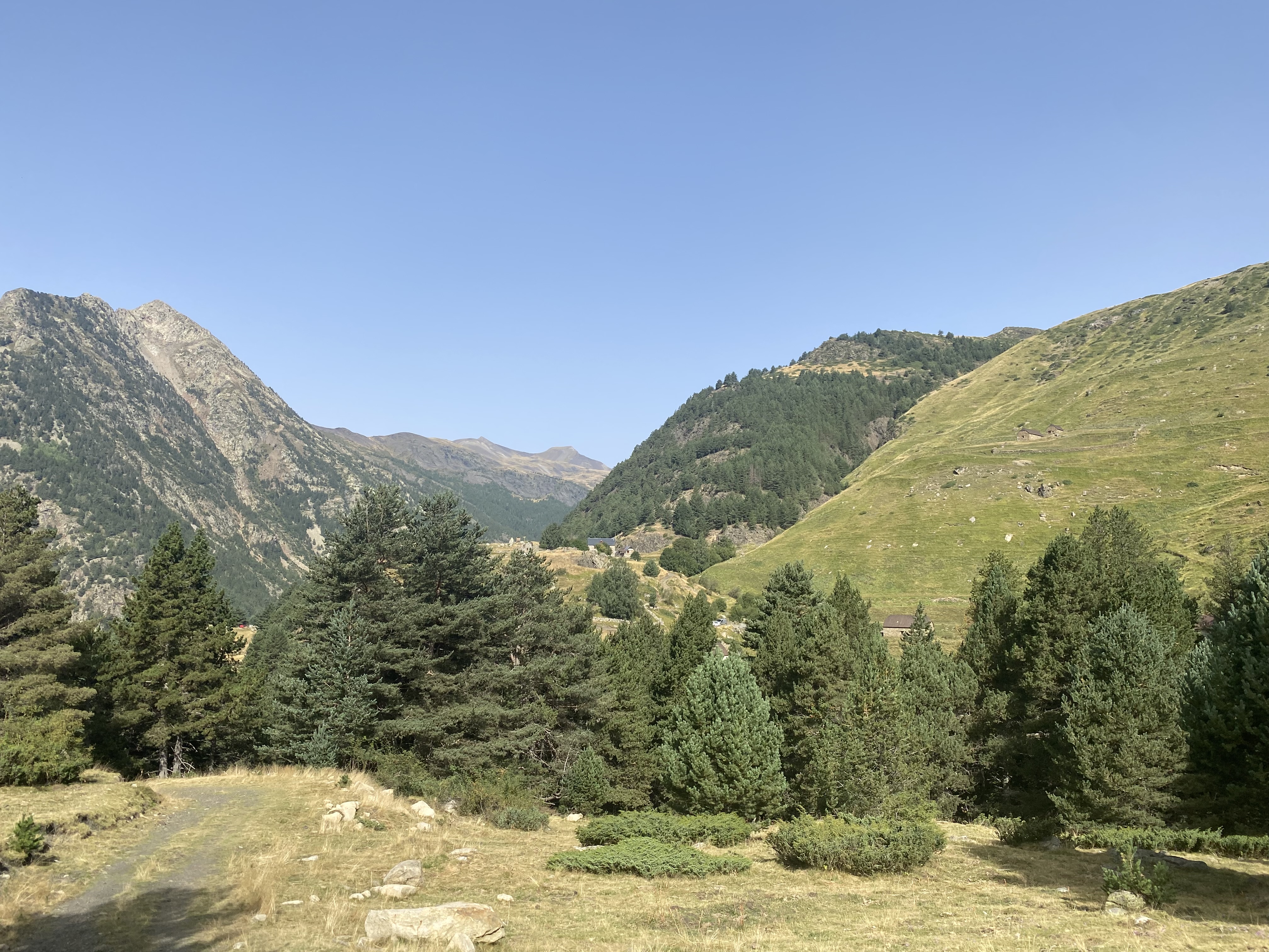 Pugem fins al coll de l’Espina a 1.407 m. des d’on es veuen unes  muntanyes ben  verdes i, darrera, s’intueix l’imponent Aneto.