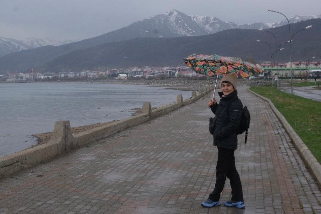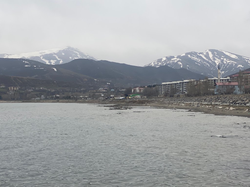 Avui el dia ha sortit gris. El llac Van és immens (3750 m2 de superfície i uns 180 km de perímetre) i està rodejat de muntanyes nevades, entre elles el volcà Nemrut (que es diu igual que la muntanya de les escultures). Hem començat a caminar al voltant del llac i ha començat a ploure.