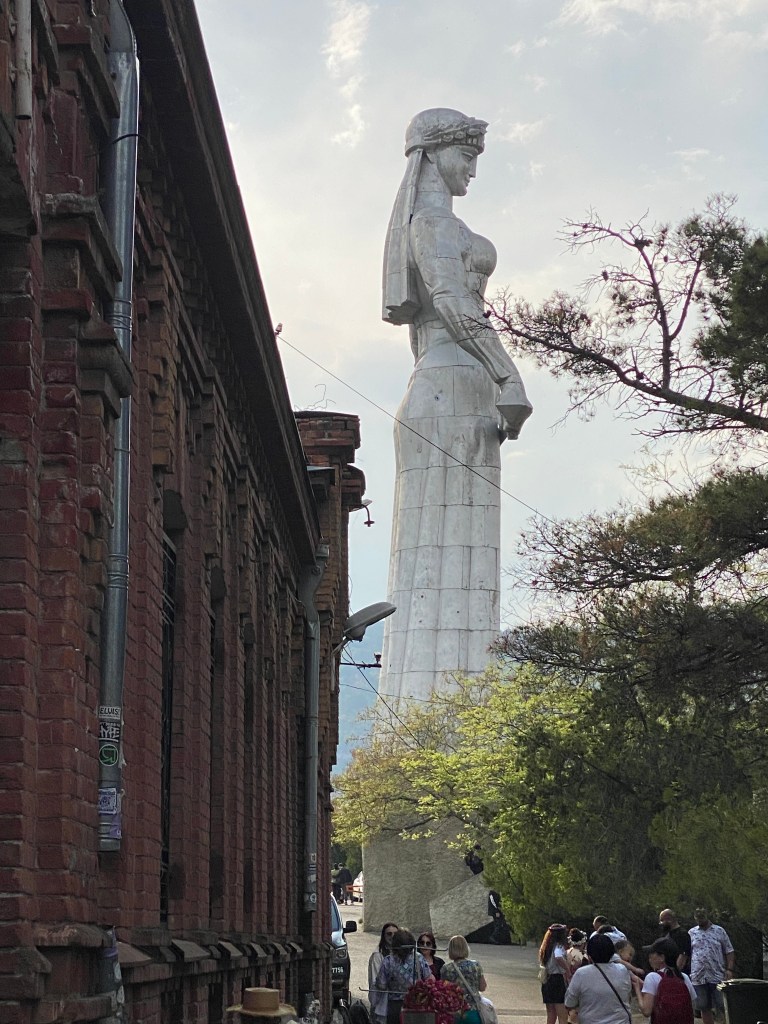 Després travessant el pont de la pau, de vidre i acer, i el parc Rike, hem agafat el funicular fins a la immensa escultura de la Kartlis Deda (la mare Geòrgia), de l’època soviètica, que porta l’ofrena d’una copa de vi, però també una espasa per defensar-se dels enemics.