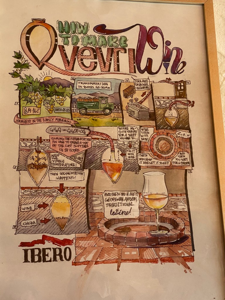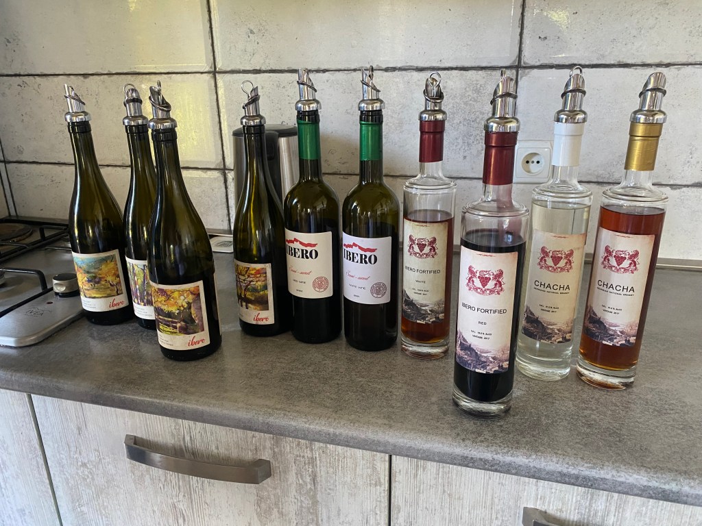 Avui fem el completíssim tast de vins que ens ha ofert la Winery Ibero, de la ma de Shota, que ens ha explicat com, en aquesta Vall d’Alazani (és el nom del riu), ja es produïen vins des de fa 8000 anys. El sistema d’elaboració és en tines de fang enterrades a terra (que es diuen Quevri). Al fons de la tina queda la pellofa, que denominen “chacha”, i que és lo que serveix per elaborar el vodka.