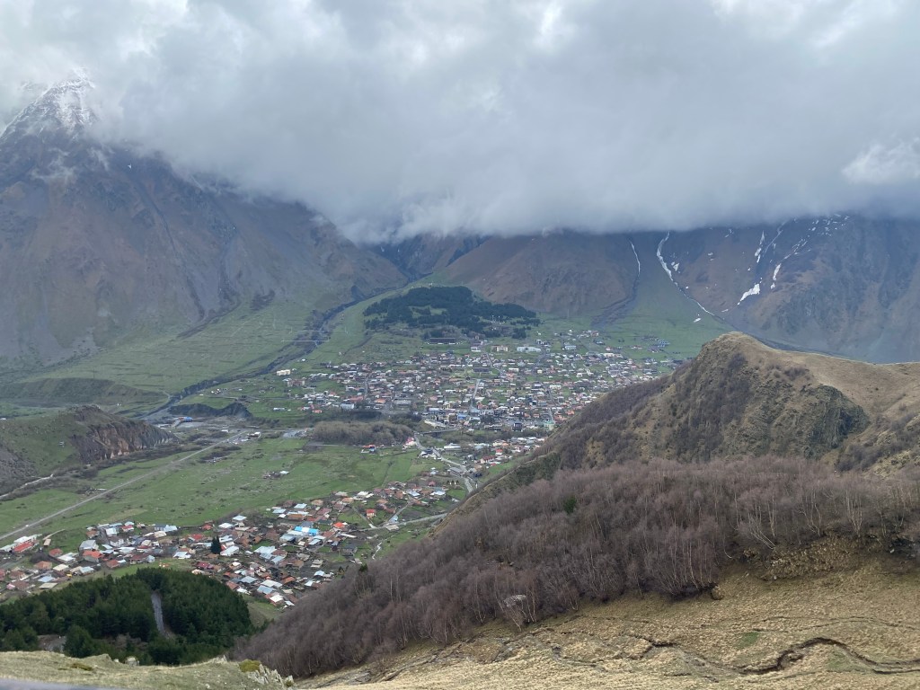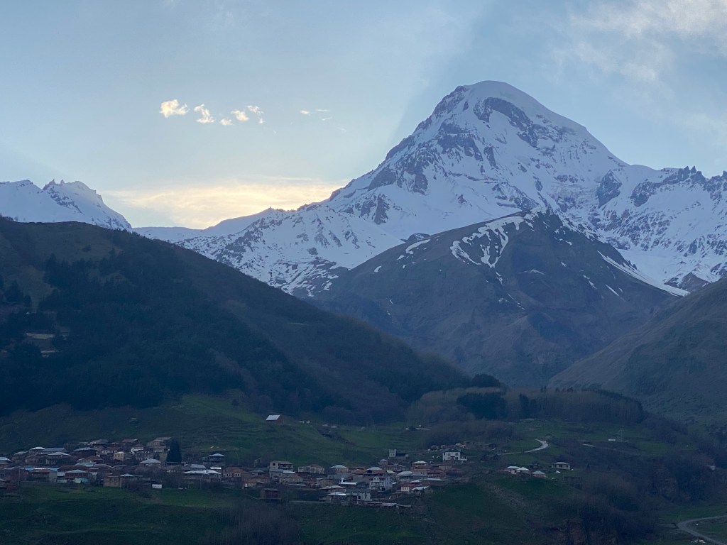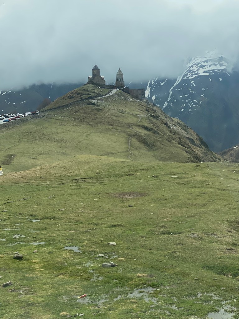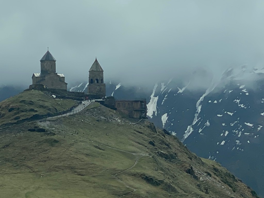 Stepantsminda te un gran atractiu turístic que és l’església Gergeti Trinity. Potser és un monestir similar als que ja hem vist fins ara, però aquest te d’especial que està rodejat d’altíssimes muntanyes com per exemple el Mont Kazbek de 5.053m.