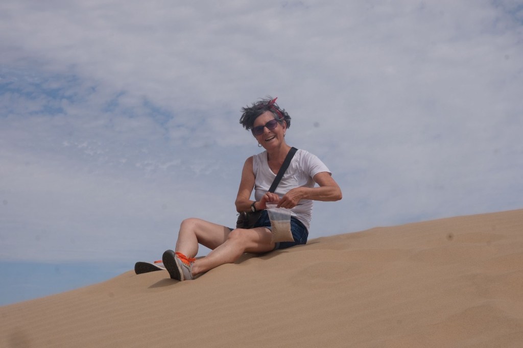 Ens estem adalt una estona gaudint de la sensació i fent-nos fotos i, quan arriba el moment de baixar, decidim ser originals: en Miquel baixa corrents duna avall i jo ho faig rodolant, fent la croqueta. Potser no torno mai mes aquí i no volia quedar-me amb les ganes.