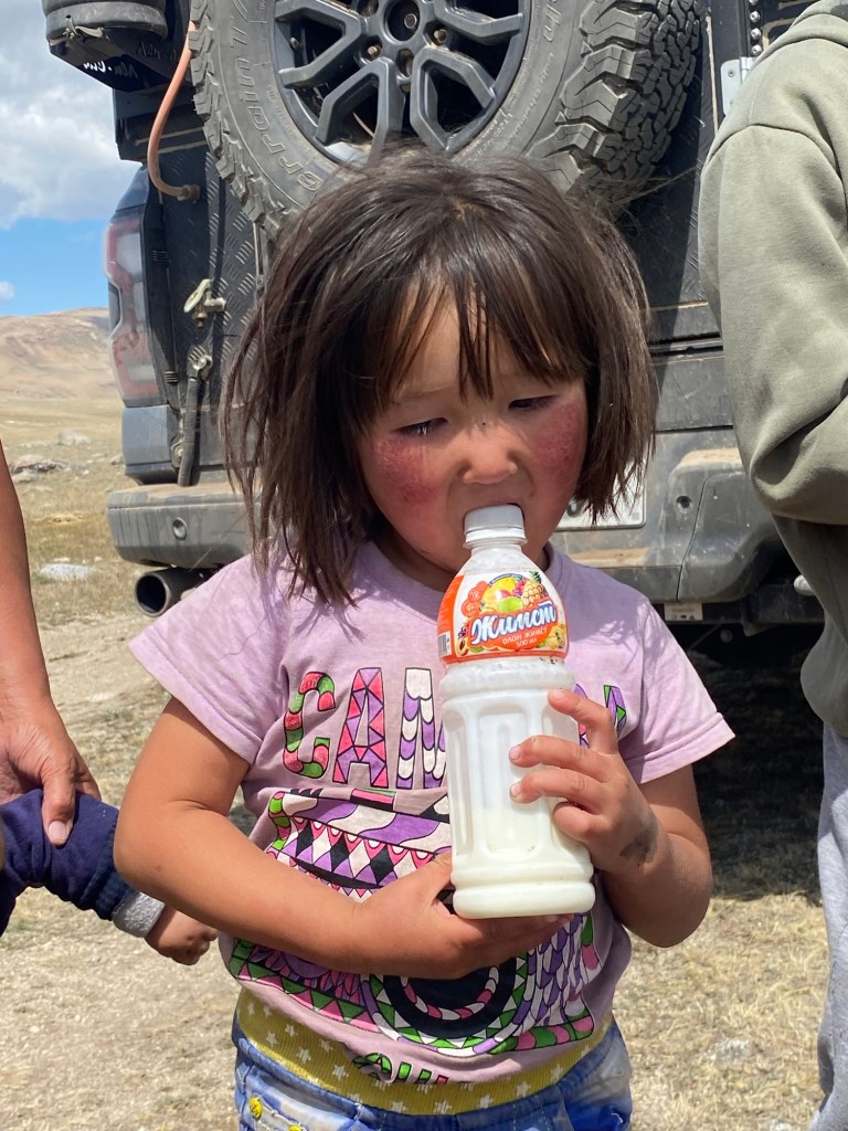 Després de tots els rituals matiners, ens acomiadem d’aquest lloc meravellós i lo genial ha estat que ja estàvem dins la furgo i s’han acostat dos noies de l’equip amb un cubell de fusta ple de llet lligat amb les cintes blaves típiques dels Ovoo: han fet una ofrena a la furgo per a que tinguem un bon viatge. Un detall preciós!