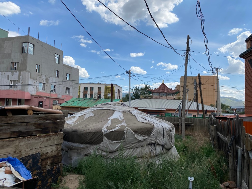 Hem pogut aparcar pel centre darrera del Monestir Gandantegchinlen Kiid que està en la part vella de la ciutat, on hi ha casetes destartalades i a punt de caure i algunes iurtes poc ufanoses. Potser son dels que han hagut de canviar l’herba per l’asfalt.