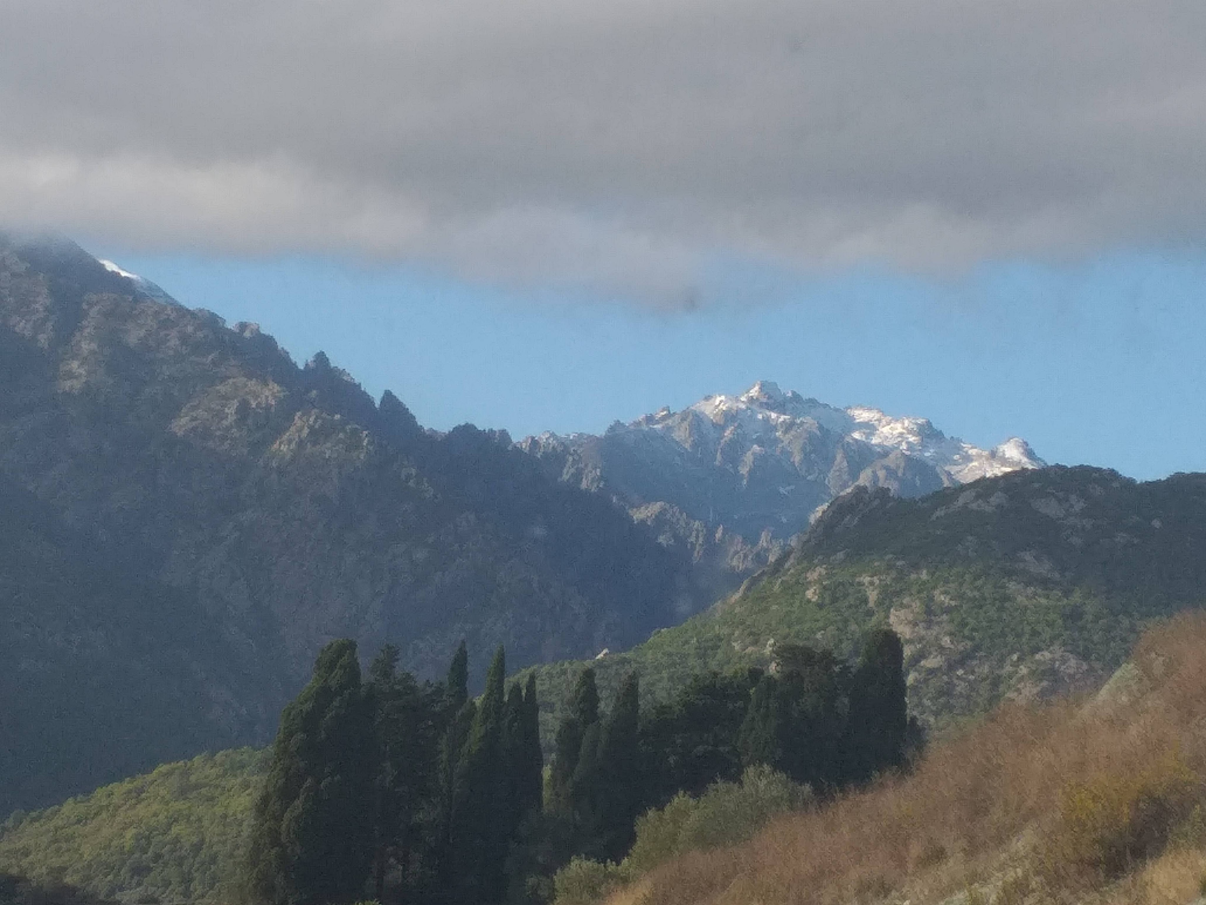 La carretera d’accés torna a ser molt estreta però el paisatge es preciós i fins i tot podem veure el Mont Cinto nevat. Aquesta és la muntanya més alta de l’illa de Còrsega amb 2.706 metres i la mes coneguda de les que es troben fent el GR-20, famosa ruta que travessa l’illa.